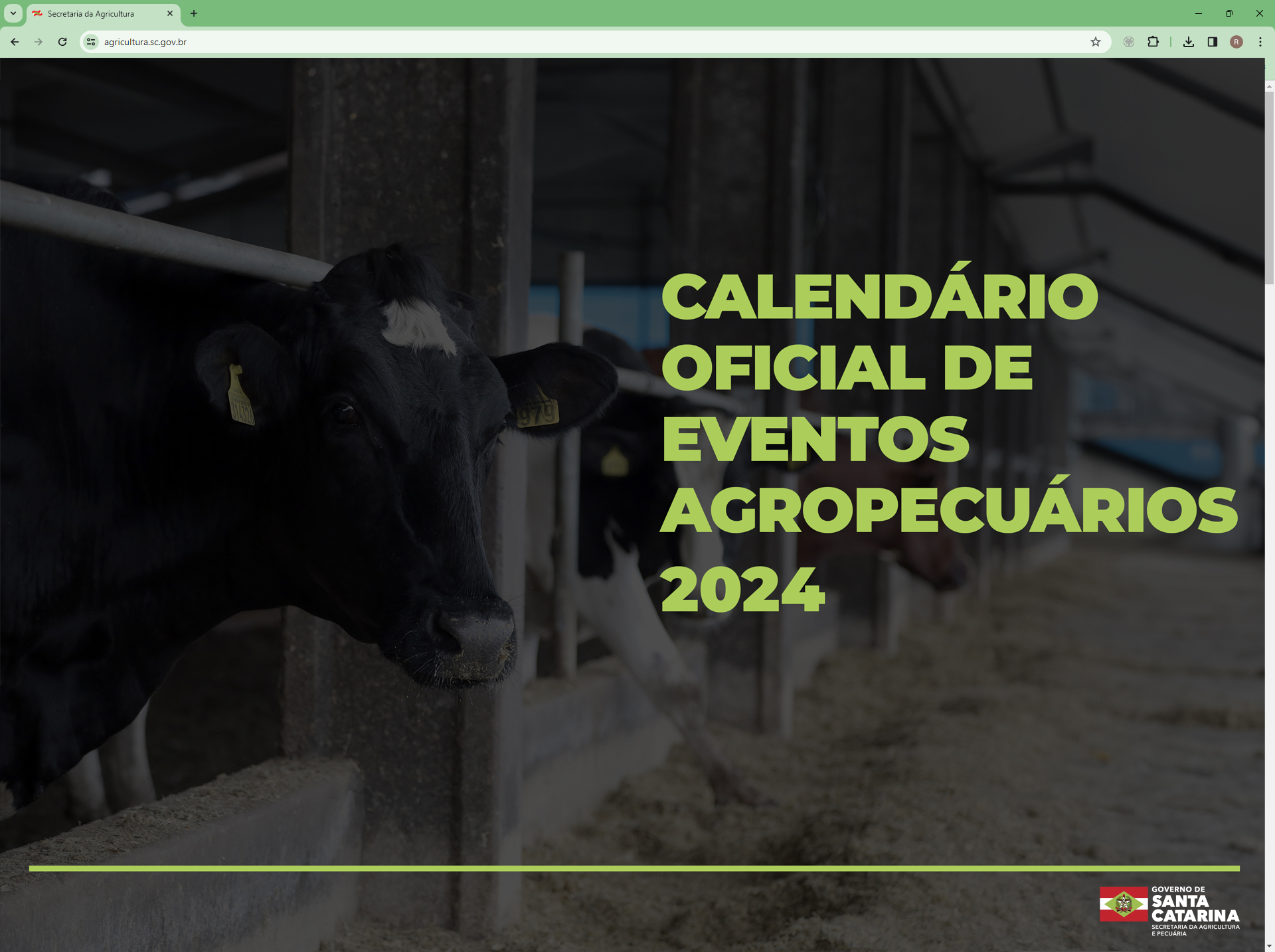 O Calendário Oficial de Eventos Agropecuários em Santa Catarina para 2024 conta com 445 eventos cadastrados até o momento . O cronograma foi aprovado e publicado pela Secretaria de Estado da Agricultura e Pecuária (SAR) por meio da Portaria SAR 60/2023, de 21 de dezembro de 2023, a autorização é de caráter zoossanitário.